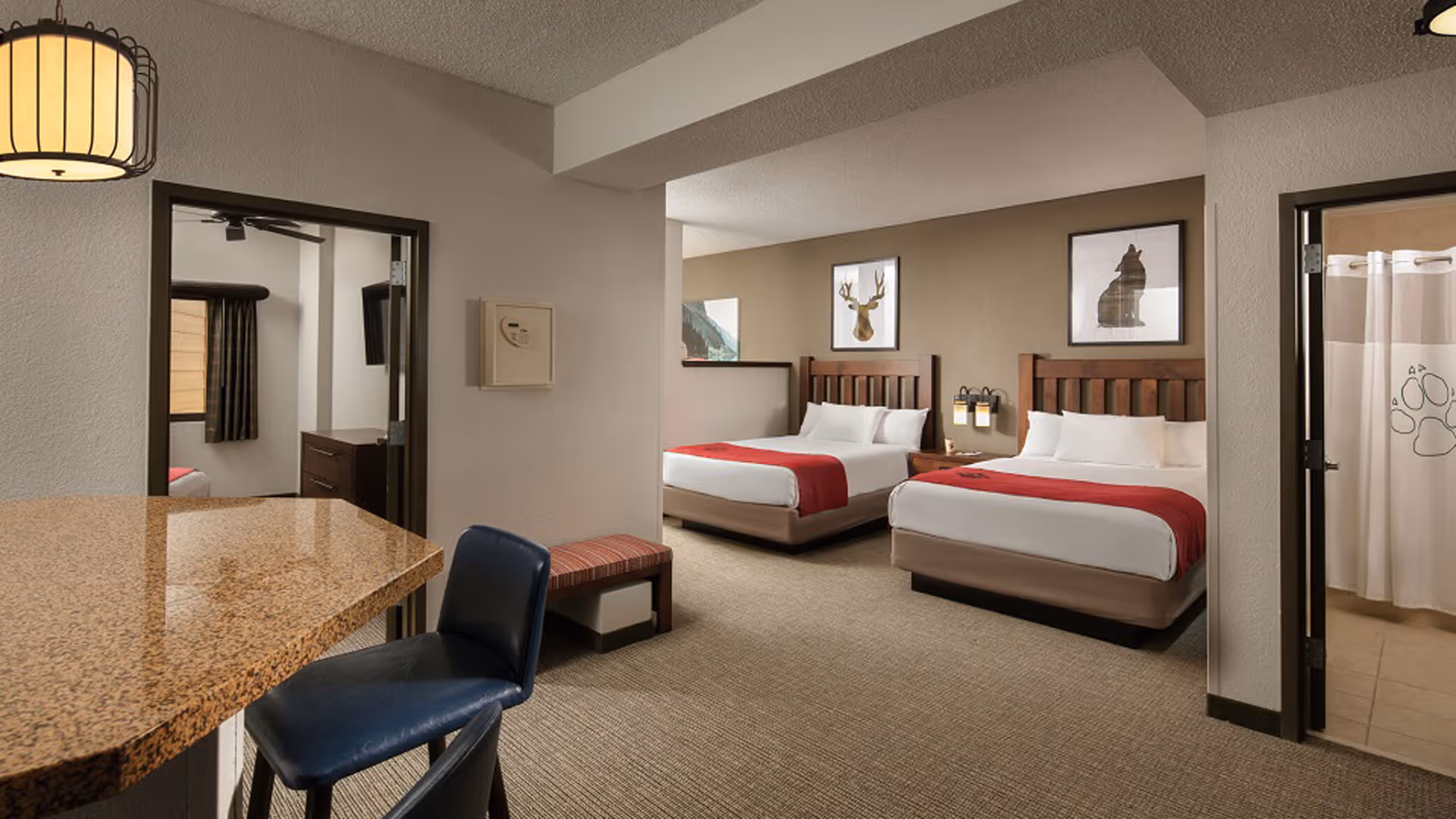 Great Wolf Lodge is located in Grapevine, Texas. The new hotel and water park have combined square feet of 686,000. Great Wolf Lodge is located on 45 acres, with 606 suites, five-story atrium, 98,000 square-foot indoor water-park, 84,000 square feet outside water-park, and parking for 1,000 cars, 27,000 square foot conference center, and a grand ballroom. The grand ballroom covers 7,500 square feet with six meeting rooms, board rooms, and 4,000 square feet of space. The resort offers a variety of restaurants, fitness rooms, and spas.